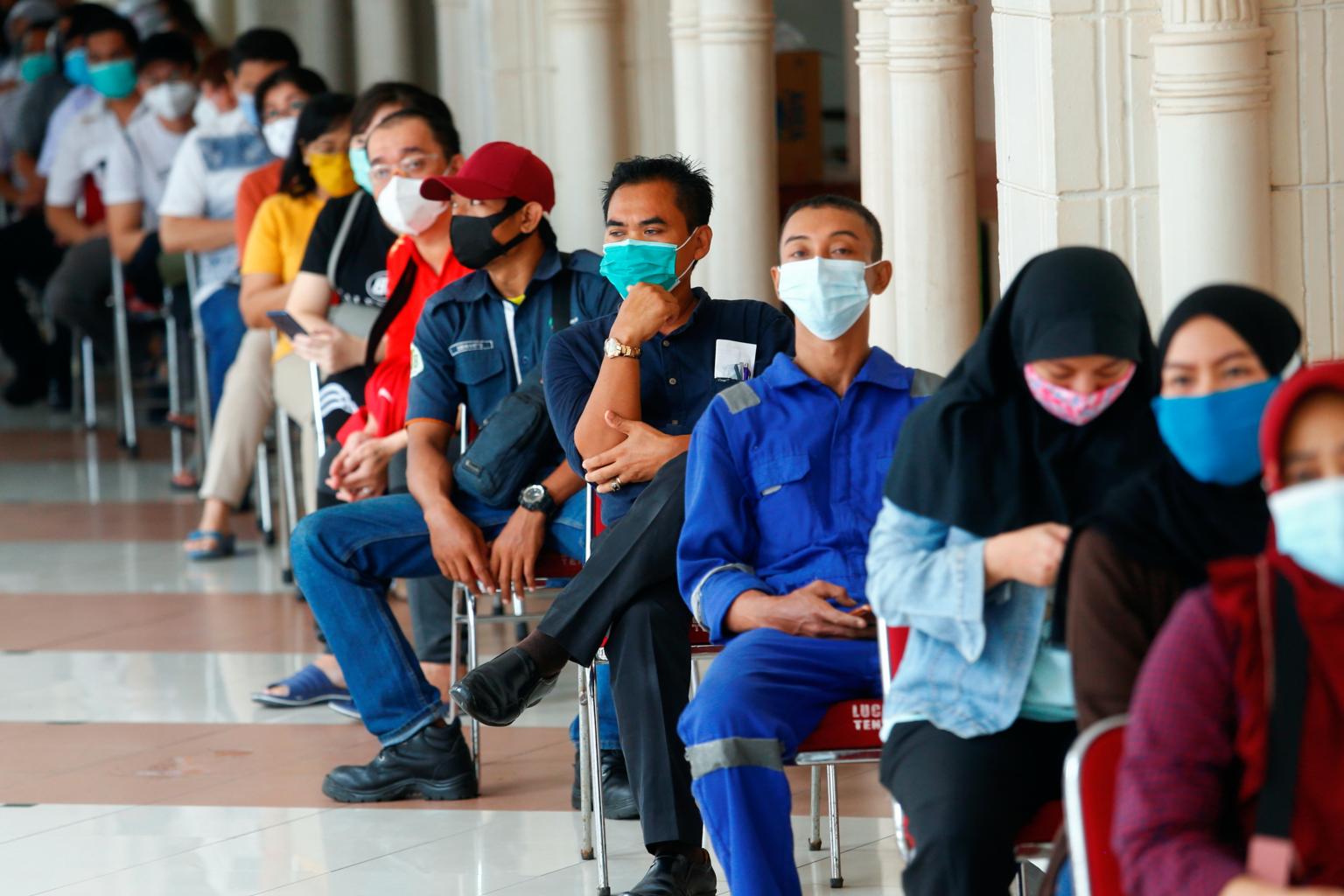 People queue before receiving a vaccine for Covid-19 in Jakarta, on Feb 17, 2021.