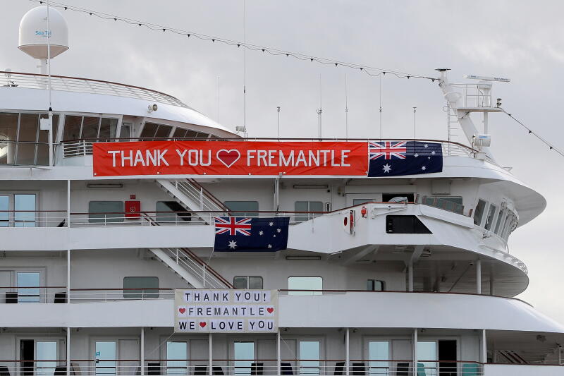 The Artania docked in the port city of Fremantle on March 27 after an earlier ban was reversed amid a spike in Covid-19 cases on board that saw three passengers taken on shore to intensive care wards.