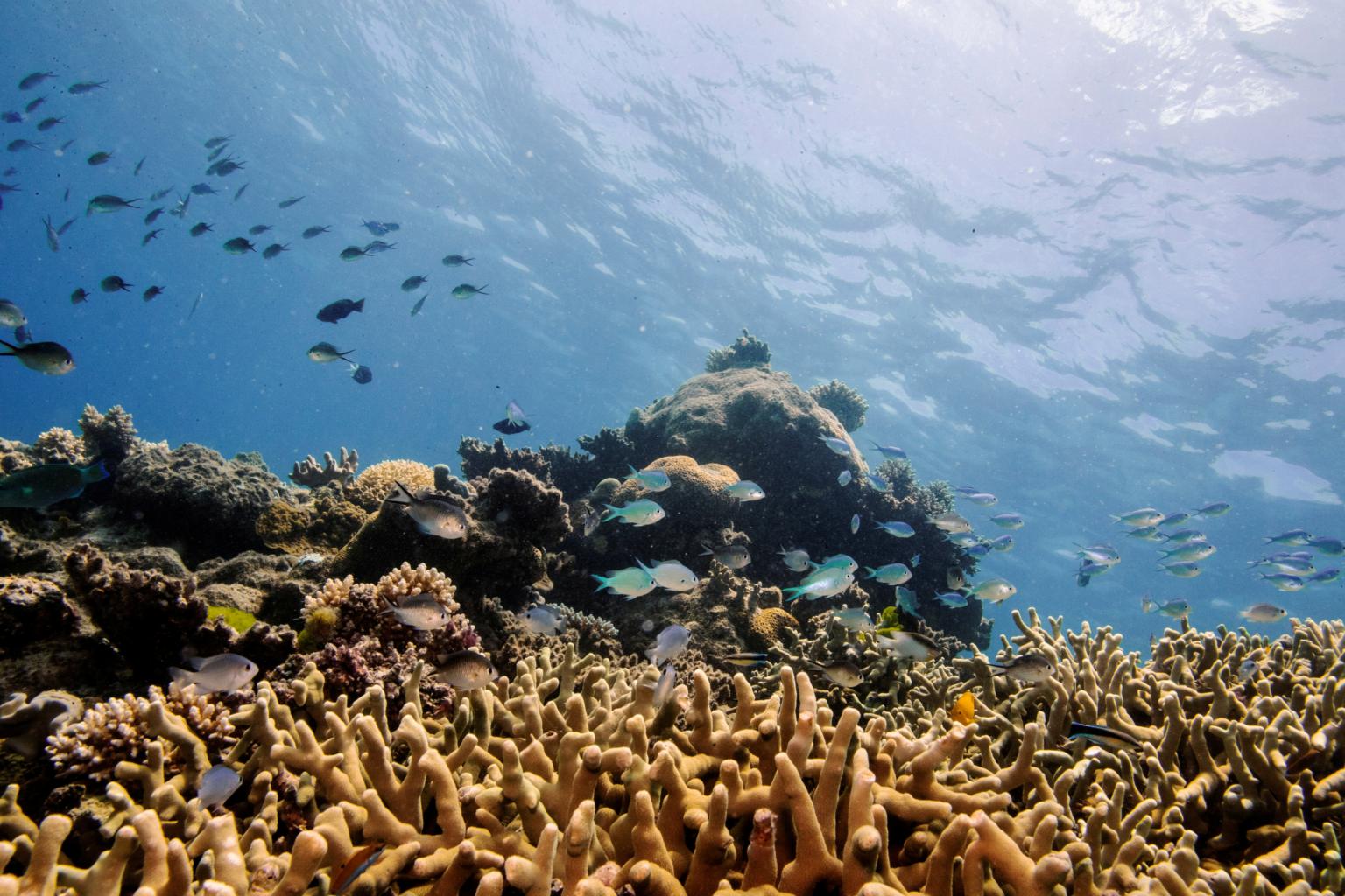 In a photo from Oct 25, 2019, assorted reef fish swim above a staghorn coral colony as it grows on the Great Barrier Reef off the coast of Cairns.