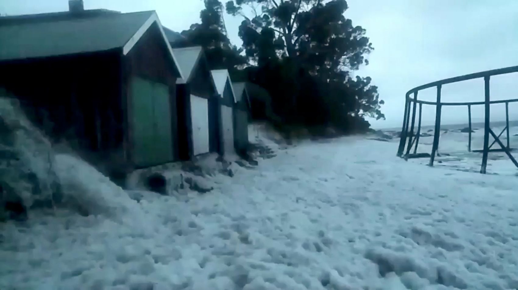 Buildings affected by a flood along the shore at Taroona, Tasmania, seen in this image obtained from a social media video taken on May 11, 2018.