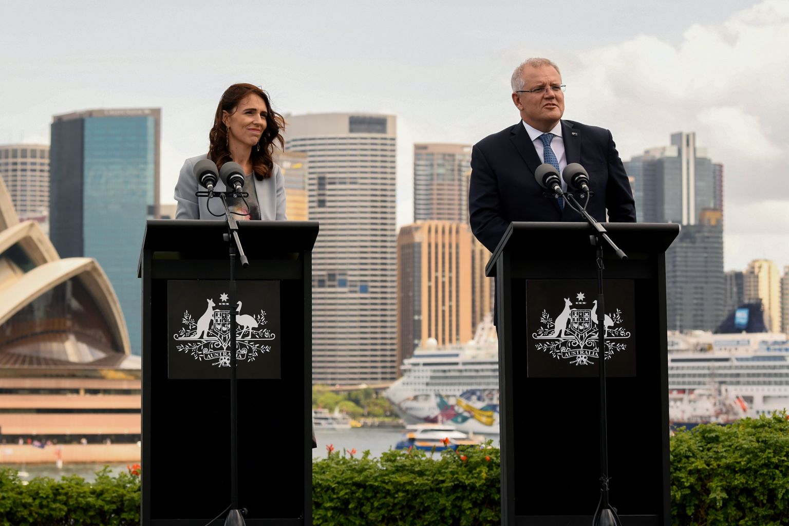 New Zealand Prime Minister Jacinda Ardern (left) and Australian Prime Minister Scott Morrison speak to the media during a press conference at Admiralty House in Sydney on Feb 28, 2020.