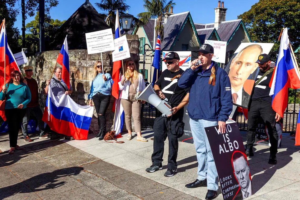 Pro-Russia activists demonstrate outside Kirribilli House, an official residence of PM Anthony Albanese, to protest against the Australian government’s decision to block the construction of the new Russian embassy building.