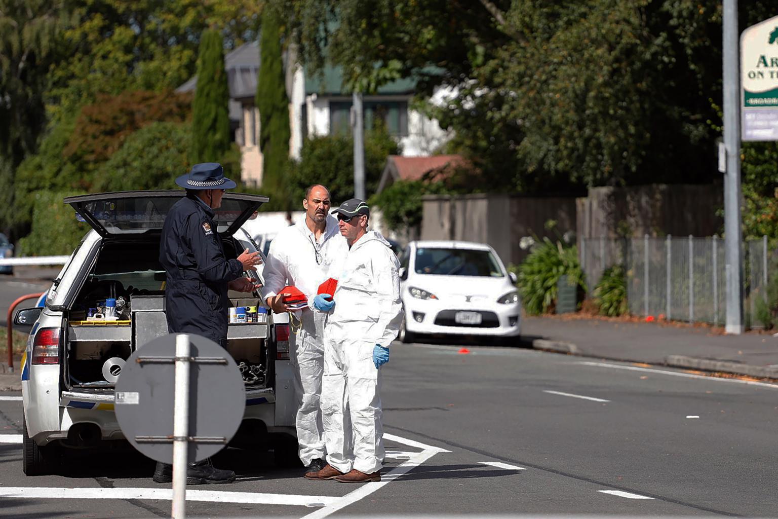 Forensic experts collect evidence near one of the attacked mosques in Christchurch, on March 16, 2019.