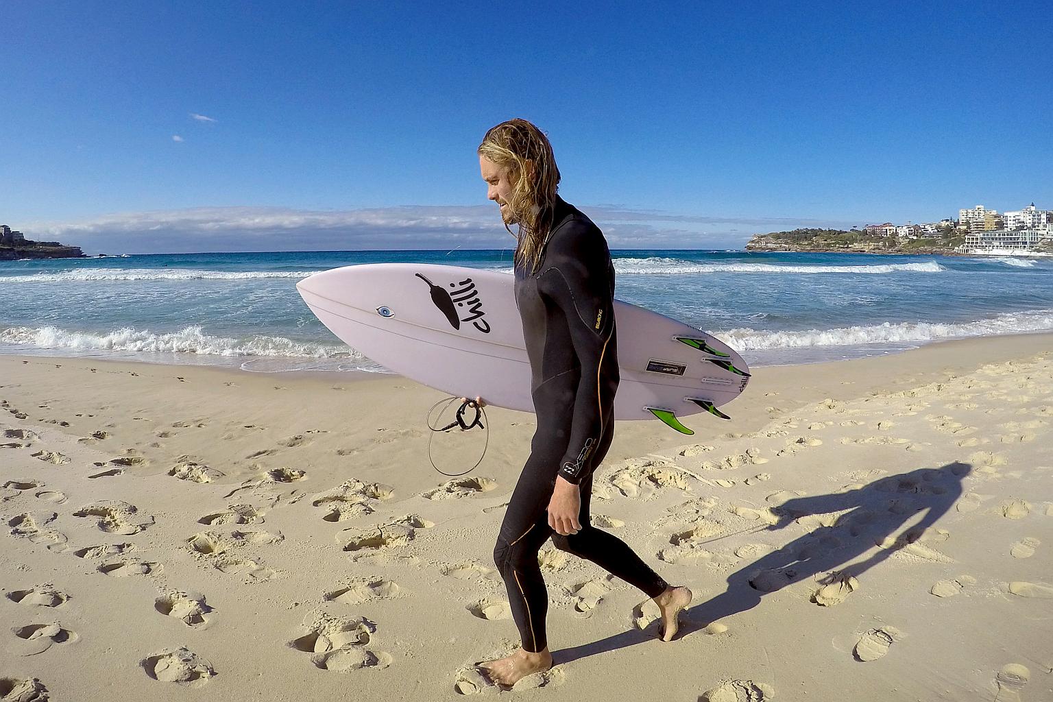 Surfer Arlen Macpherson carries his board, which has an electronic shark repellent device installed, along Sydney's Bondi Beach in Australia on Aug 18, 2015.