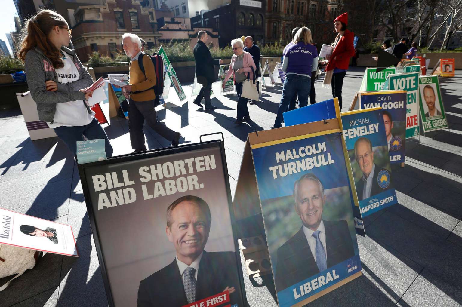 Early voters in Australia's July 2 general election walk to a polling centre past banners promoting Labor leader Bill Shorten (left) and Liberal Party Prime Minister Malcolm Turnbull.