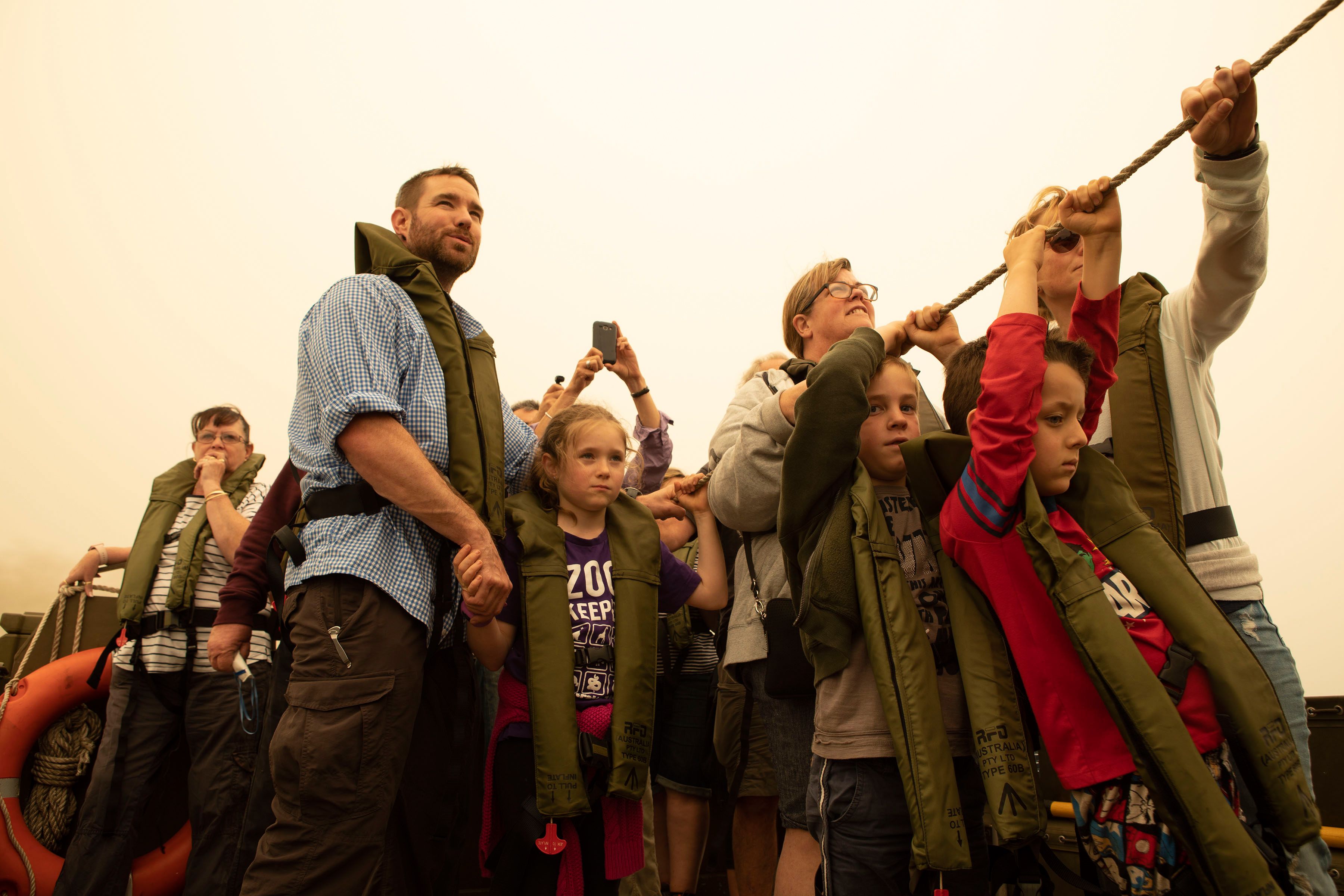 Evacuees from Mallacoota, in Australia's Victoria state, on a landing craft to board the Royal Australian Navy's MV Sycamore, during bush fire relief efforts.