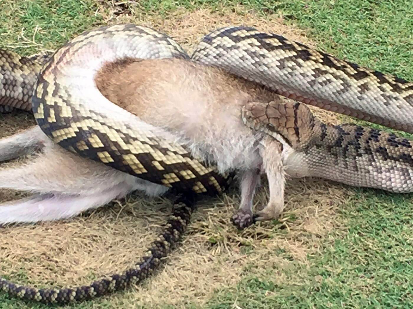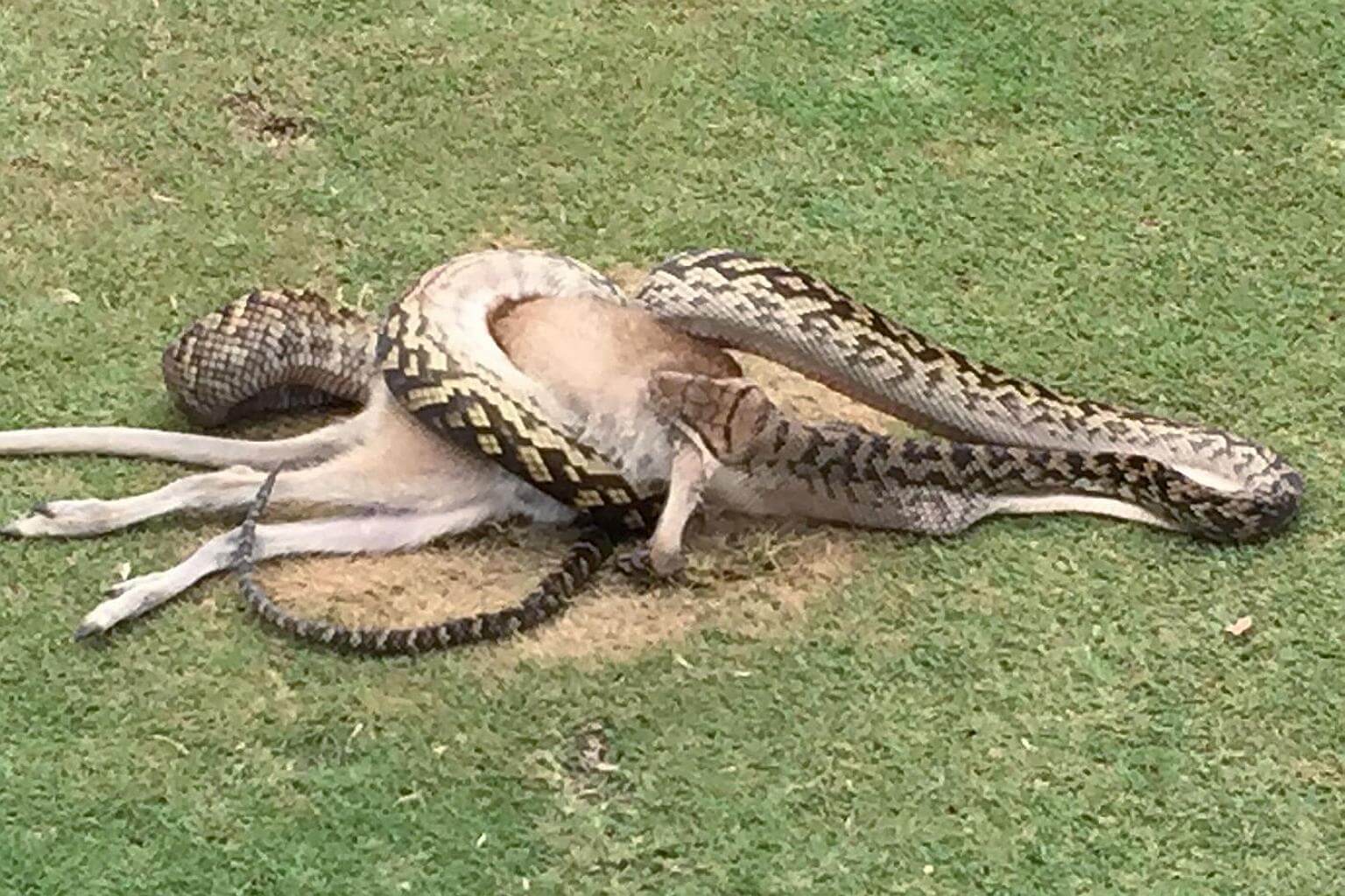 A python wrestling with a wallaby in the middle of a fairway on a golf course in Cairns on Dec 10, 2016.