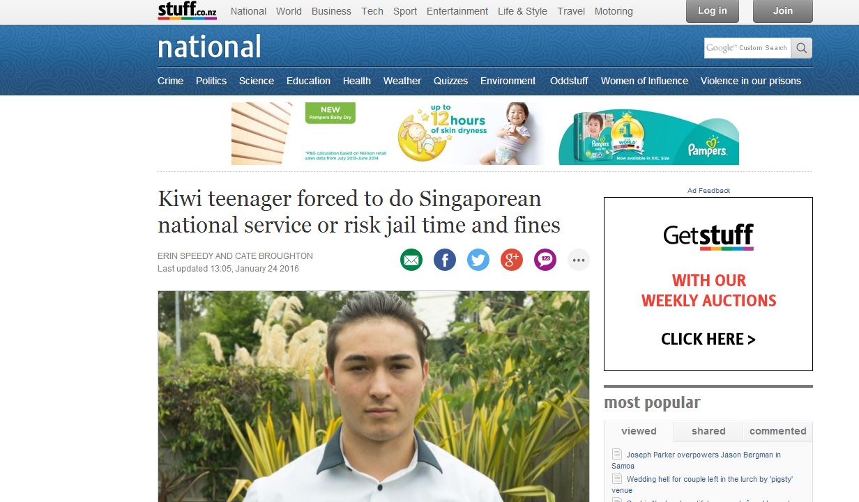 According to stuff.co.nz, the Singapore authorities have demanded that Mr Brandon Smith, who lives in the city of Dunedin, report for a pre-enlistment medical screening.
