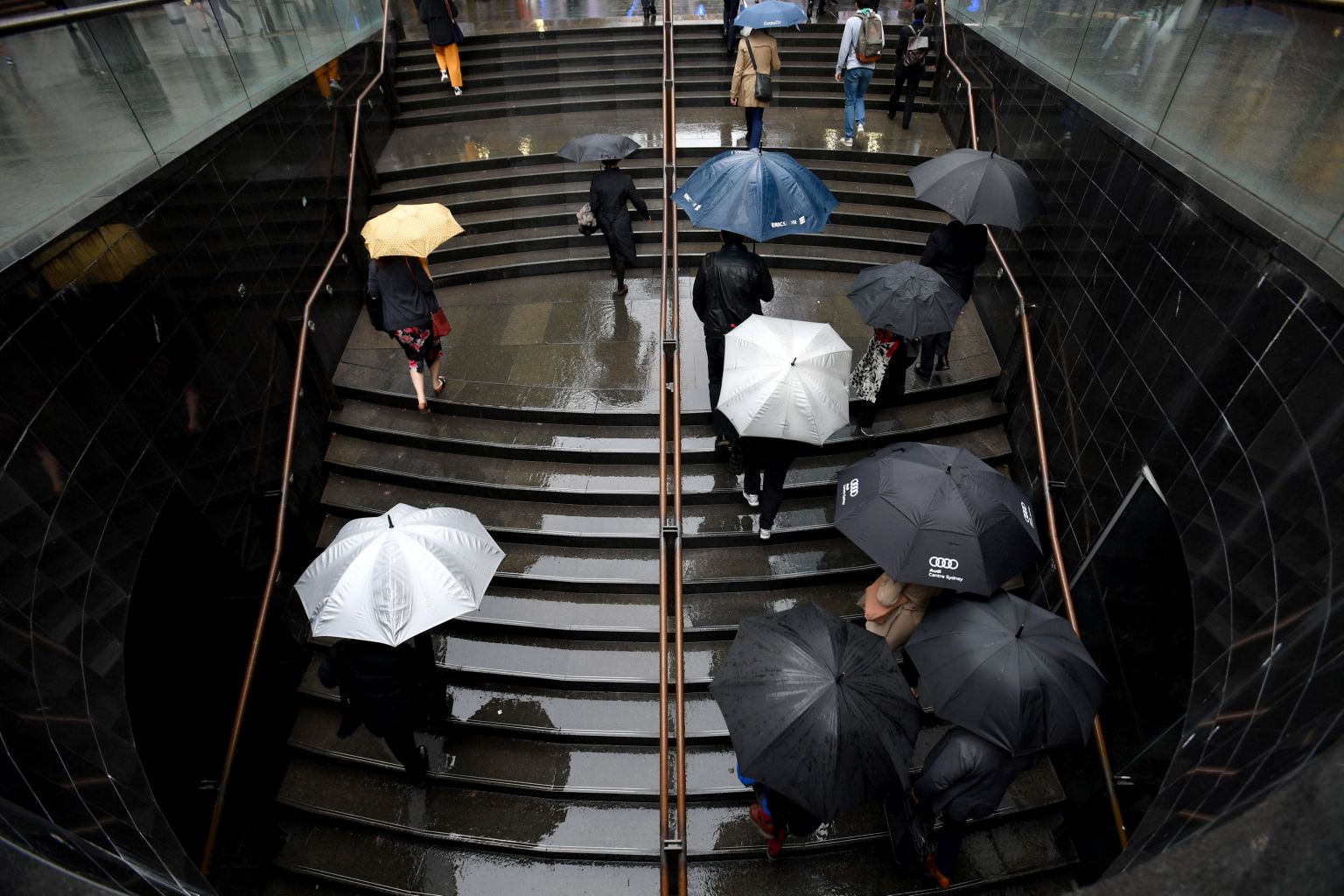 Office workers are seen during wet weather in Sydney, on Oct 4, 2018.