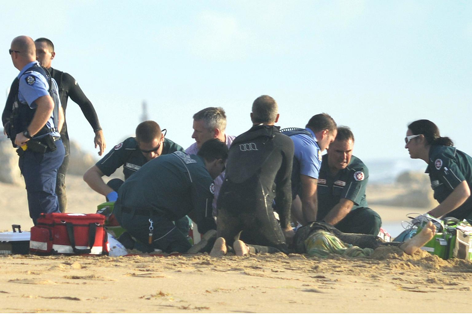 Ambulance and police officers helping the critically injured surfer on May 31 after a shark ripped off his leg in an attack in Australia's west.