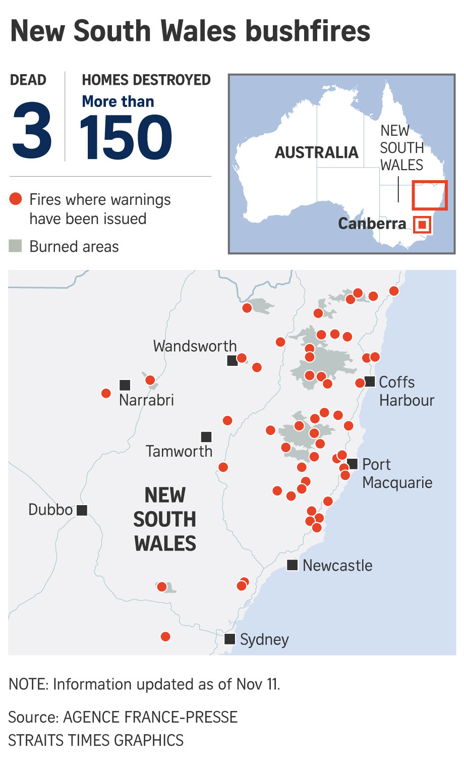 Fires in northern New South Wales (NSW) and Queensland over the weekend killed three people and destroyed more than 150 homes.
