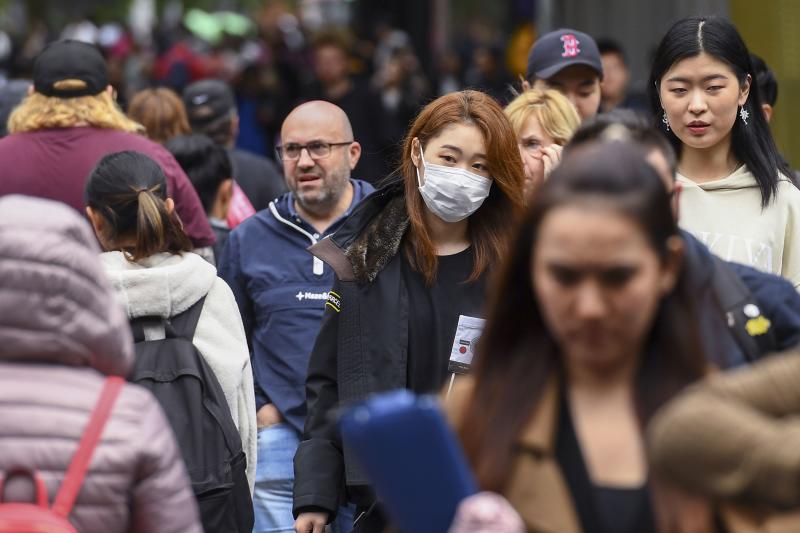A woman wearing a face mask crosses the street in Melbourne on March 5, 2020.