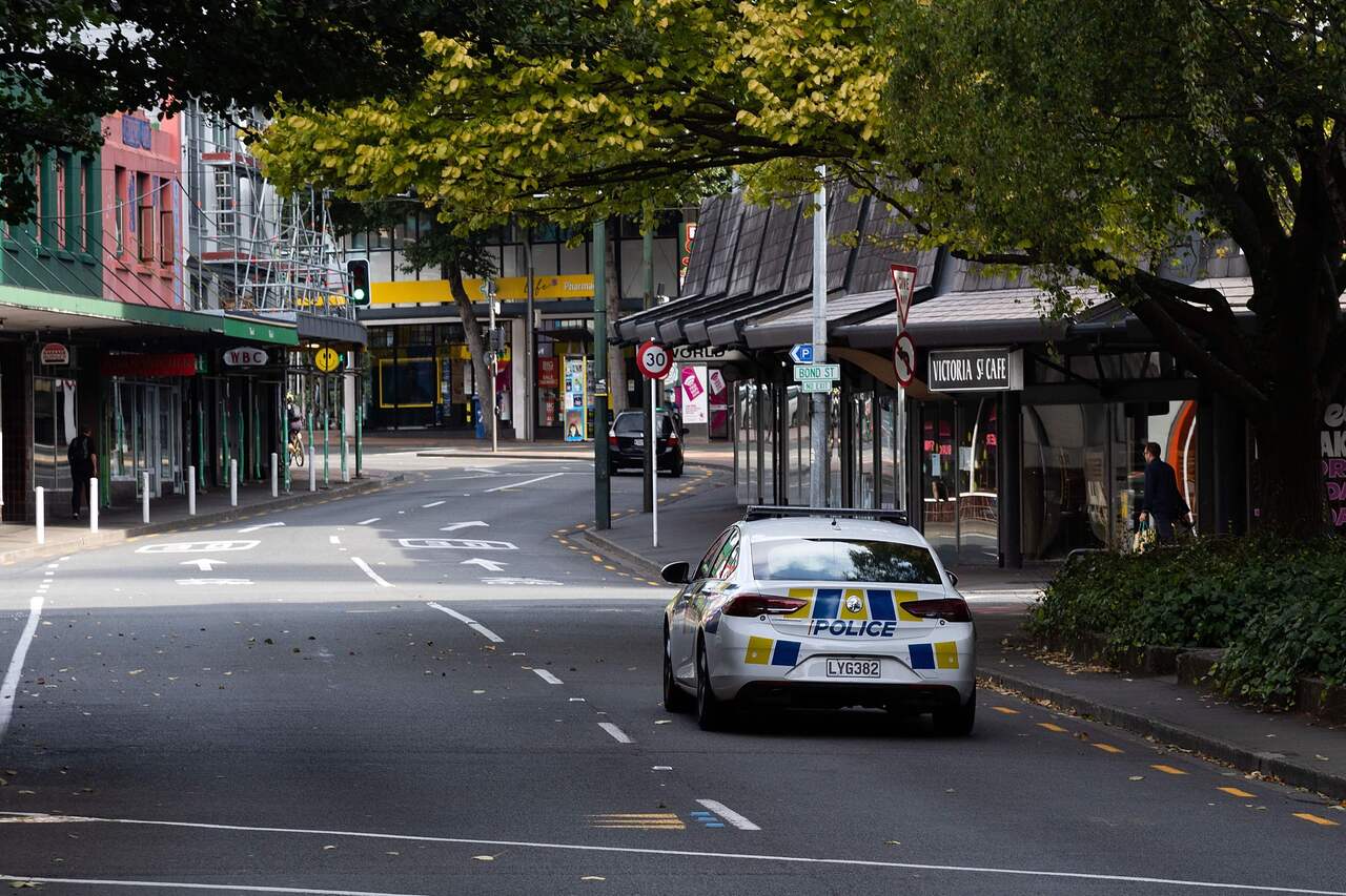 A police car patrols the central business district after the Level 4 lockdown came into force, in Wellington on March 26, 2020.