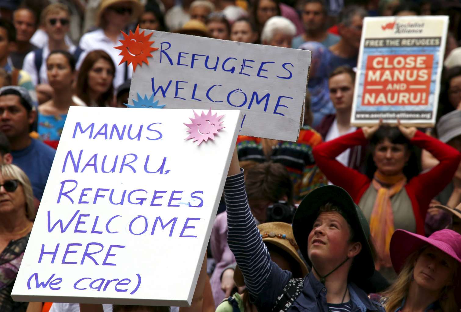 Demonstrators hold aloft placards during a rally in support of refugees that was part of a national campaign in central Sydney, Australia, on Oct 11, 2015.