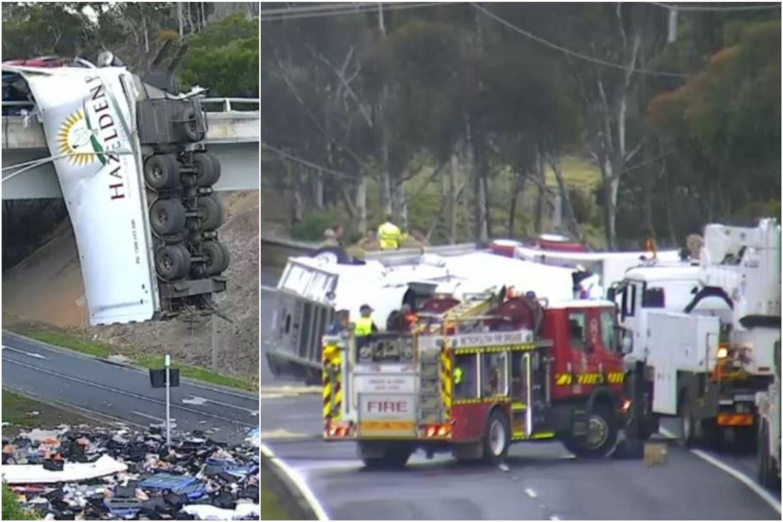 Dramatic photos of the aftermath, which were shared widely online, show the contents of the truck spilled across the road below the bridge.