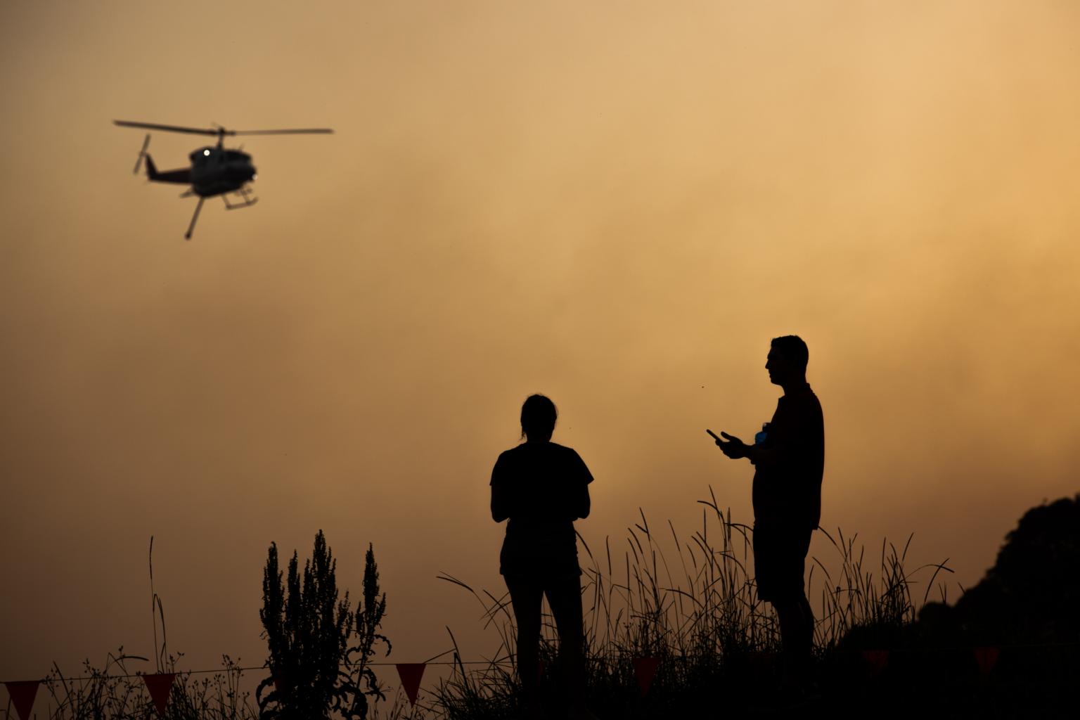 A water bombing helicopter flies over a bushfire as residents look on, in Forster, New South Wales, Australia, on Nov 7, 2019.