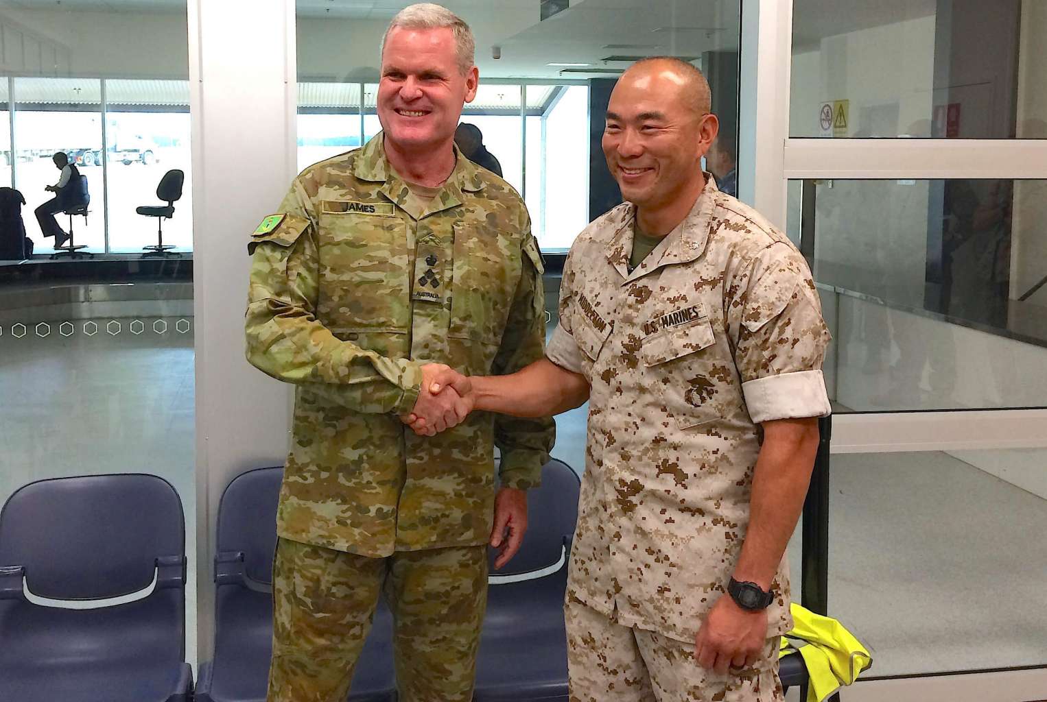 Lieutenant Colonel Brian Middleton (right) shakes hands with Australian Army officer Brigadier Mick Ryan after arriving for the sixth annual Marines' deployment at Darwin, on April 18, 2017.