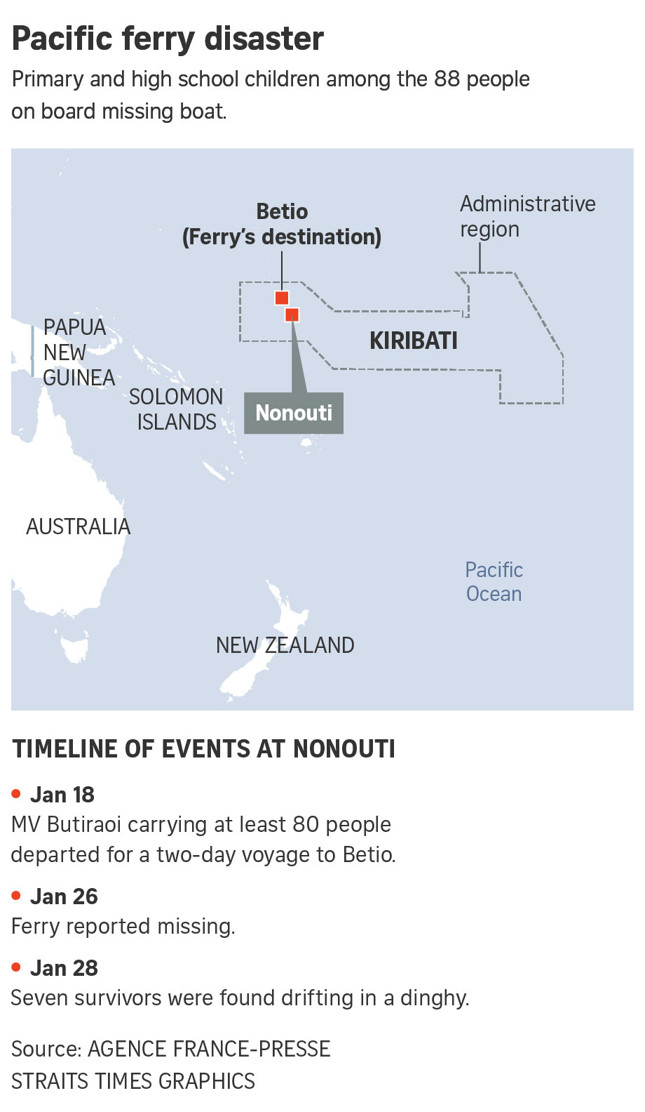 There were 88 people onboard the MV Butiraoi when the ferry departed on Jan 18, which included 10 children of primary age and 13 high school students.