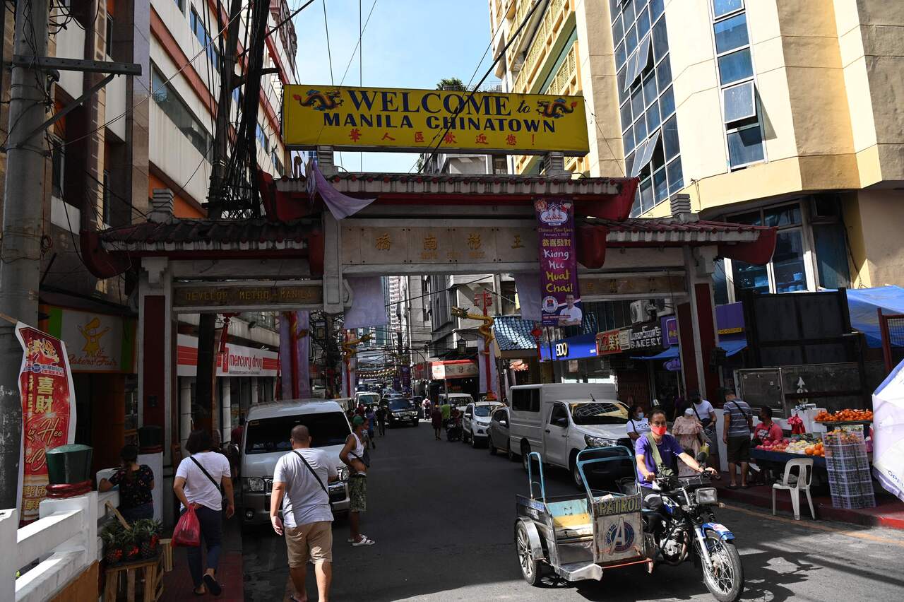 Pedestrians and motorists walk past an arch in Chinatown district of Manila on Jan 28, 2022.