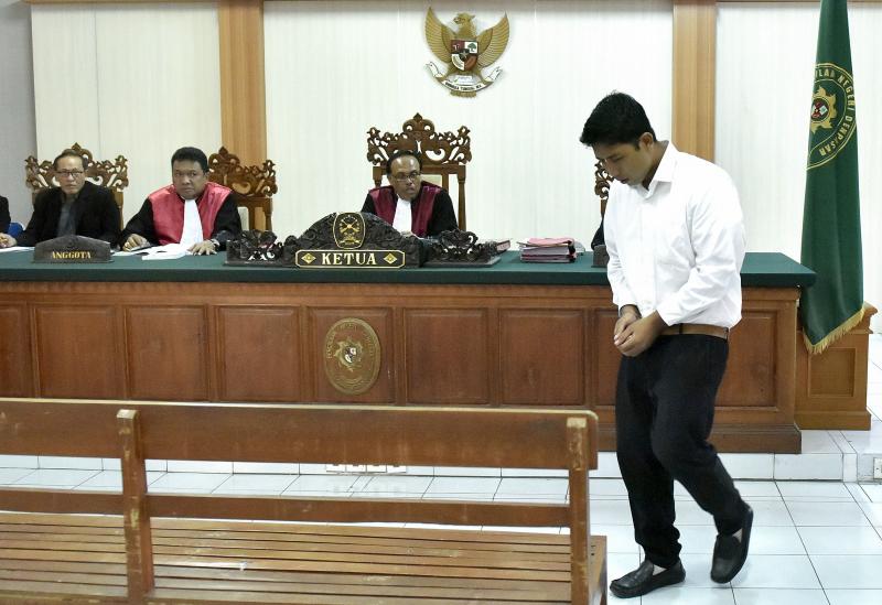 Indonesian defendant I Putu Astawa, 25, walks into a court in Denpasar on March 26, 2018, before being sentenced to 15 years in jail for stabbing an elderly Japanese couple to death during a botched burglary.