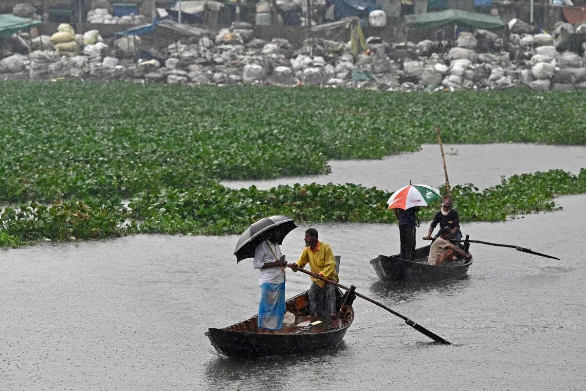 Men ride on boats as it rains in Dhaka, Bangladesh, on Aug 29, 2023.