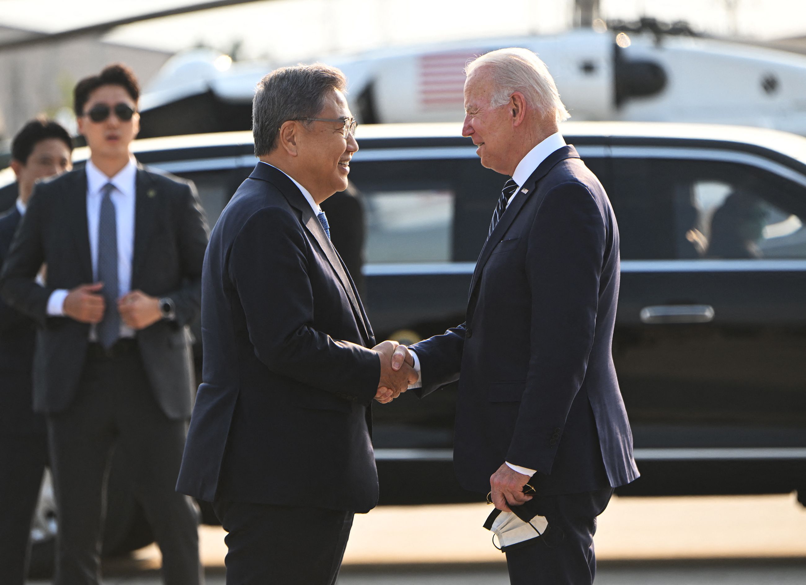 <p>US President Joe Biden (R) shakes hands with South Korea's Foreign Minister Park Jin upon arriving at Osan Air Base in Pyeongtaek on May 20, 2022. (Photo by Saul LOEB / AFP)</p>