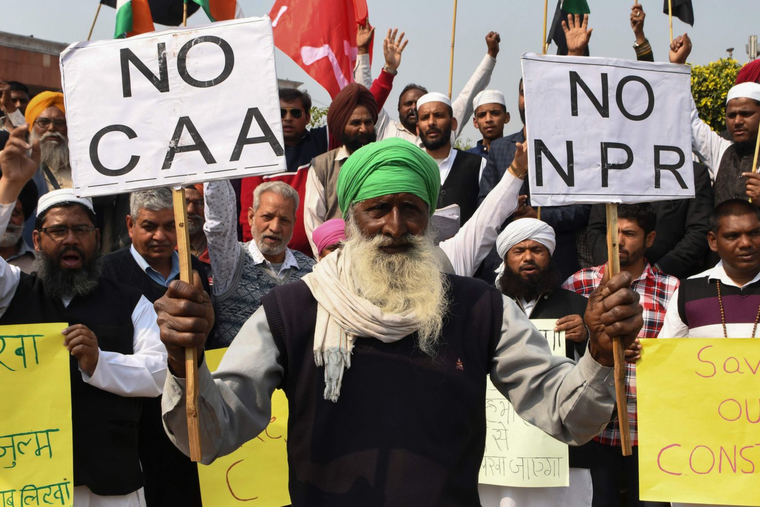 Demonstrators shout slogans and hold placards during a protest against the Indian government's Citizenship Amendment Act (CAA) and the National Register of Citizens (NRC), in Amritsar, on Feb 24, 2020.
