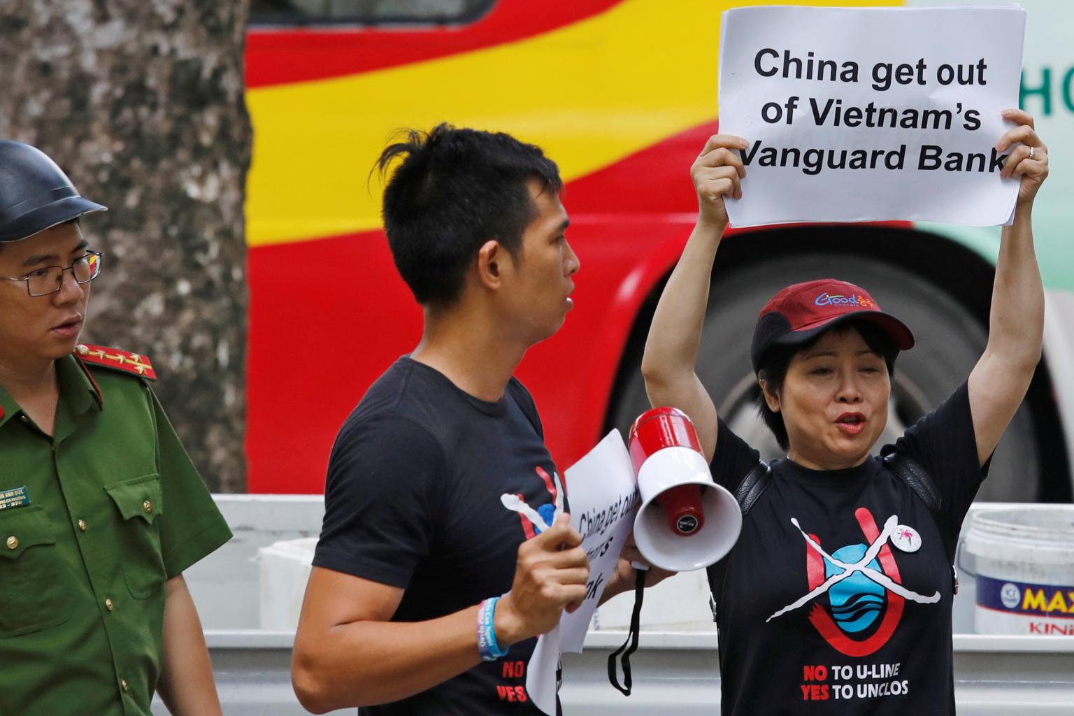 Anti-China protesters hold placards during a demonstration in front of the Chinese embassy in Hanoi, Vietnam on Aug 6, 2019.