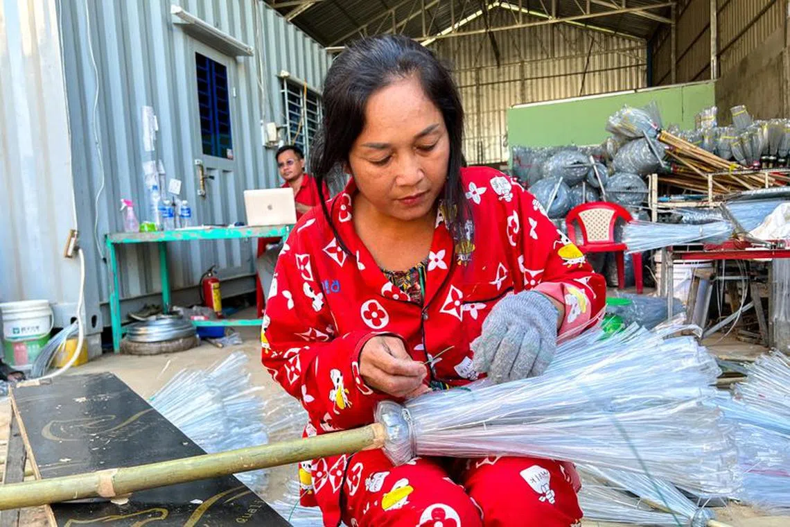 A woman working on a plastic broomstick at a warehouse in Phnom Penh, Cambodia, on Jan 15.