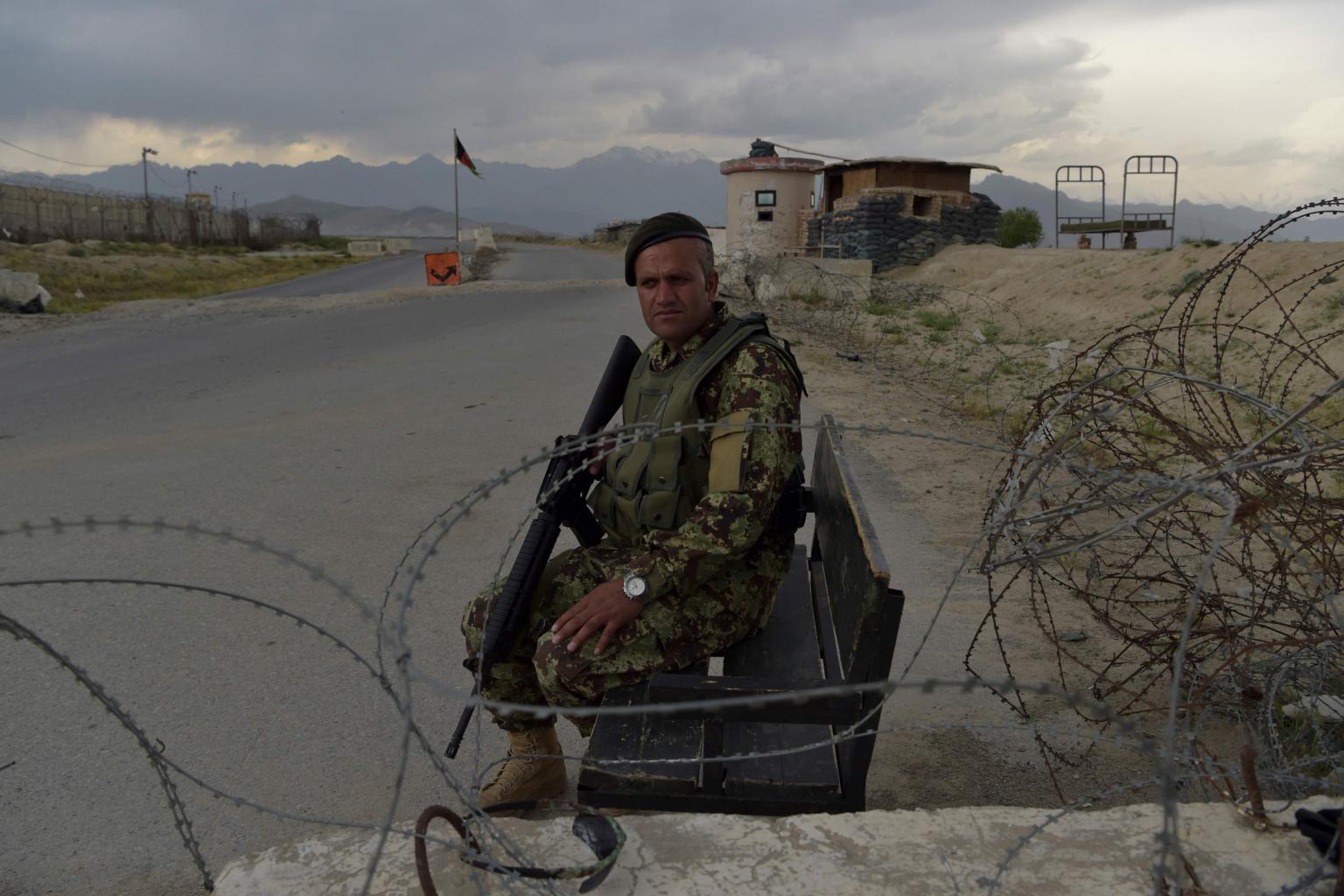 An Afghan National Army soldier sits at a road checkpoint near the a US military base in Bagram, Afghanistan, on April 29, 2021.