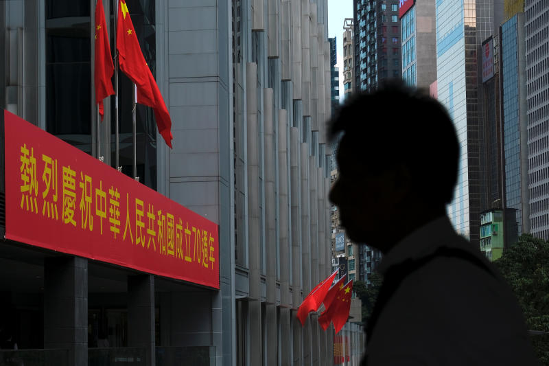 Chinese flags and banners are seen outside a building ahead of China's national day in Hong Kong on Sept 25, 2019.