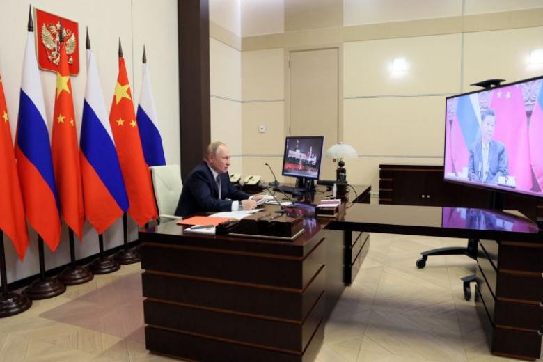 Mr Vladimir Putin holds talks with Mr Xi Jinping via a video link at his residence outside Moscow on Dec 15, 2021.