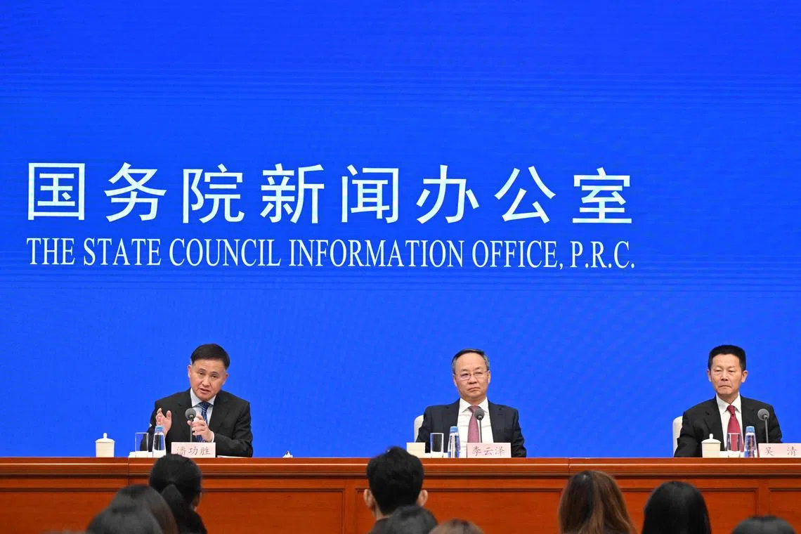 Mr Pan Gongsheng (left), governor of the People’s Bank of China, Mr Li Yunze (centre), Minister of the National Financial Regulatory Administration, and Mr Wu Qing, chairman of the China Securities Regulatory Commission, at a press conference at China’s State Council Information office.