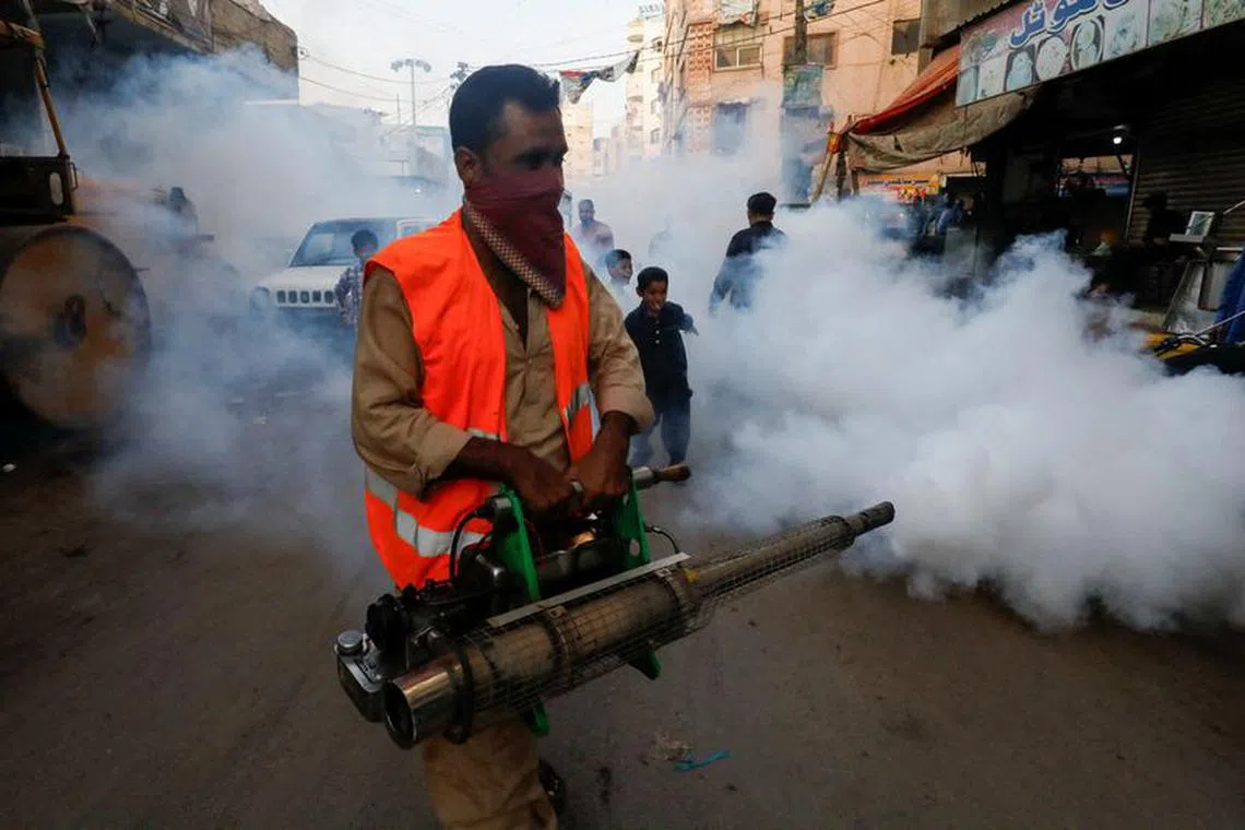 A worker spraying fumigation vapour to stem the spread of Dengue virus in Karachi, Pakistan.