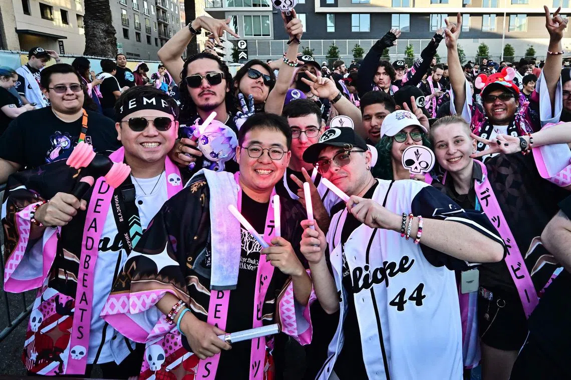 Fans posing as they await entry to the Hollywood Palladium for a sold-out concert by Virtual YouTuber Mori Calliope.