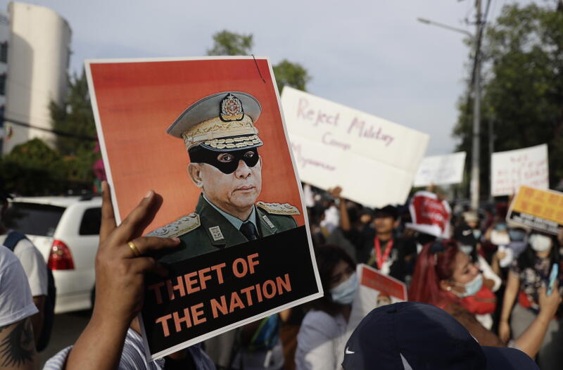 Demonstrators hold a placard with an image of Myanmar military junta chief Senior General Min Aung Hlaing during a protest outside the Chinese Embassy in Yangon on Feb 12, 2021.