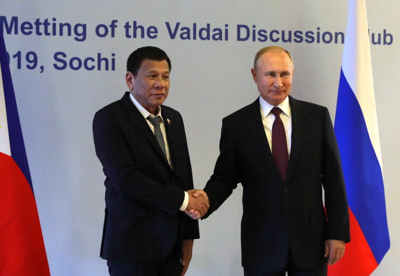 Philippine President Rodrigo Duterte and Russian President Vladimir Putin shake hands during their meeting on the sidelines of the Valdai International Discussion Club meeting in Sochi, Russia, on Oct 3, 2019.