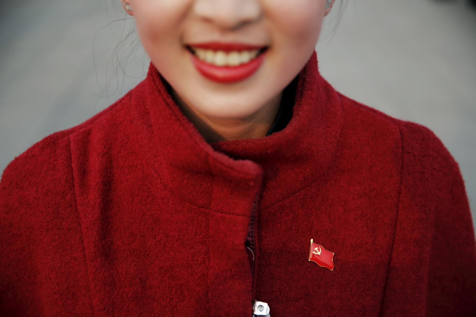 A hostess wears a pin of China's Communist Party flag ahead of the closing ceremony of National People's Congress (NPC) in Beijing.