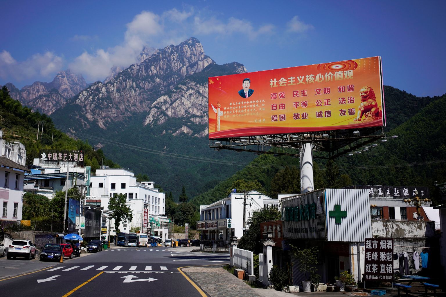A poster with a portrait of Chinese President Xi Jinping overlooks a street in Huangshan, Anhui province, China, on Sept 16, 2017. Mr Xi, on Oct 18, 2017, vows to keep up the country's years-long battle against smog to ensure "blue skies" and promote a revolution in clean energy.