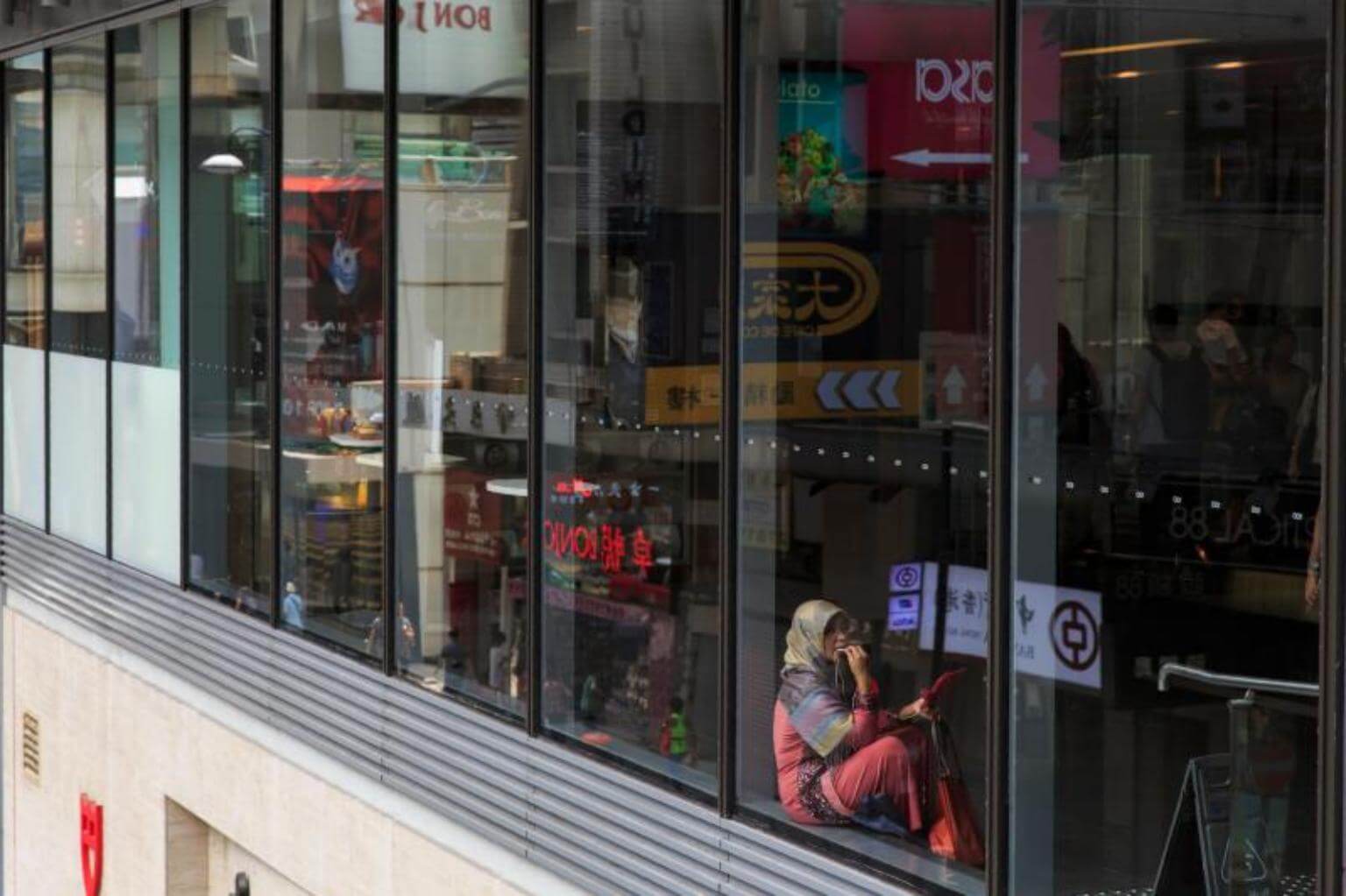 A migrant worker employed as a domestic maid speaks on her phone as shopfront signage is seen reflected on windows along a public walkway in Hong Kong's Central district on August 13, 2017.