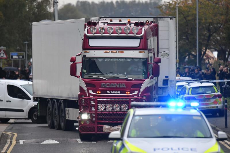 Police officers drive away a lorry (centre) in which 39 dead bodies were discovered, sparking a murder investigation, at Waterglade Industrial Park in Grays, east of London, on Oct 23, 2019.