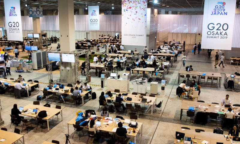 Journalists at the International Press Centre of the G-20 summit in Osaka on June 27, 2019.