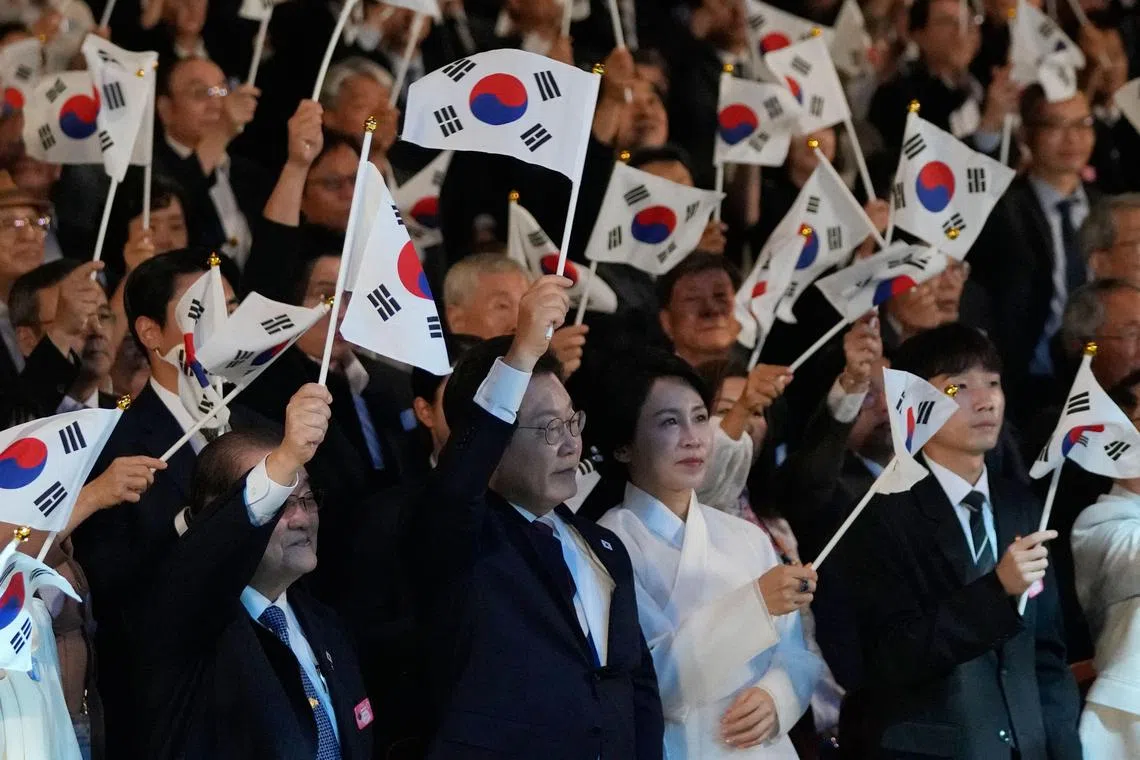 South Korean President Lee Jae Myung (centre) and his wife Kim Hye-kyung (to his left) wave national flags during the 80th anniversary of Korea’s liberation from Japanese colonial rule, in Seoul, on Aug 15.