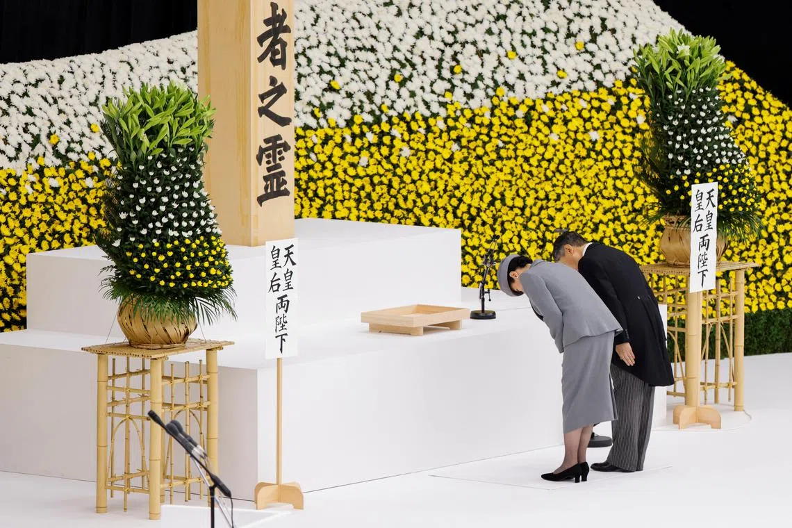 Japan’s Emperor Naruhito and Empress Masako bow during a memorial service ceremony marking the 80th anniversary of Japan’s surrender in World War Two, at Budokan Hall, in Tokyo, Japan, on Aug 15.