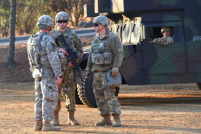 This file photo taken on March 14, 2017, shows US soldiers standing guard during a joint medical evacuation drill that is part of the annual Key Resolve and Foal Eagle military exercise at an army hospital in Goyang, South Korea.
