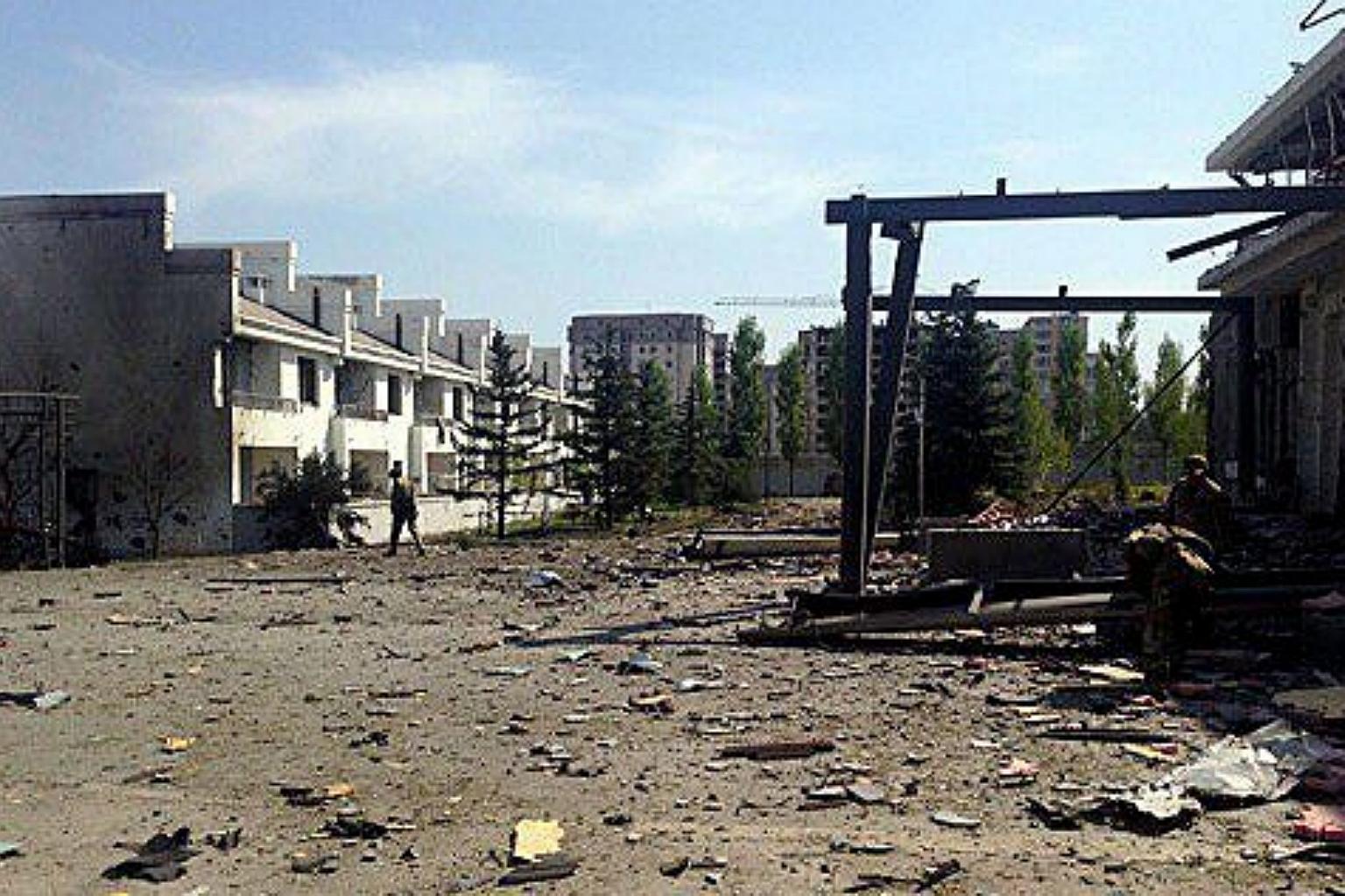 A general view showing damages outside of the building of the Chinese Embassy in the aftermath of a terrorist attack in Bishkek, Kyrgyzstan on Aug 30, 2016.