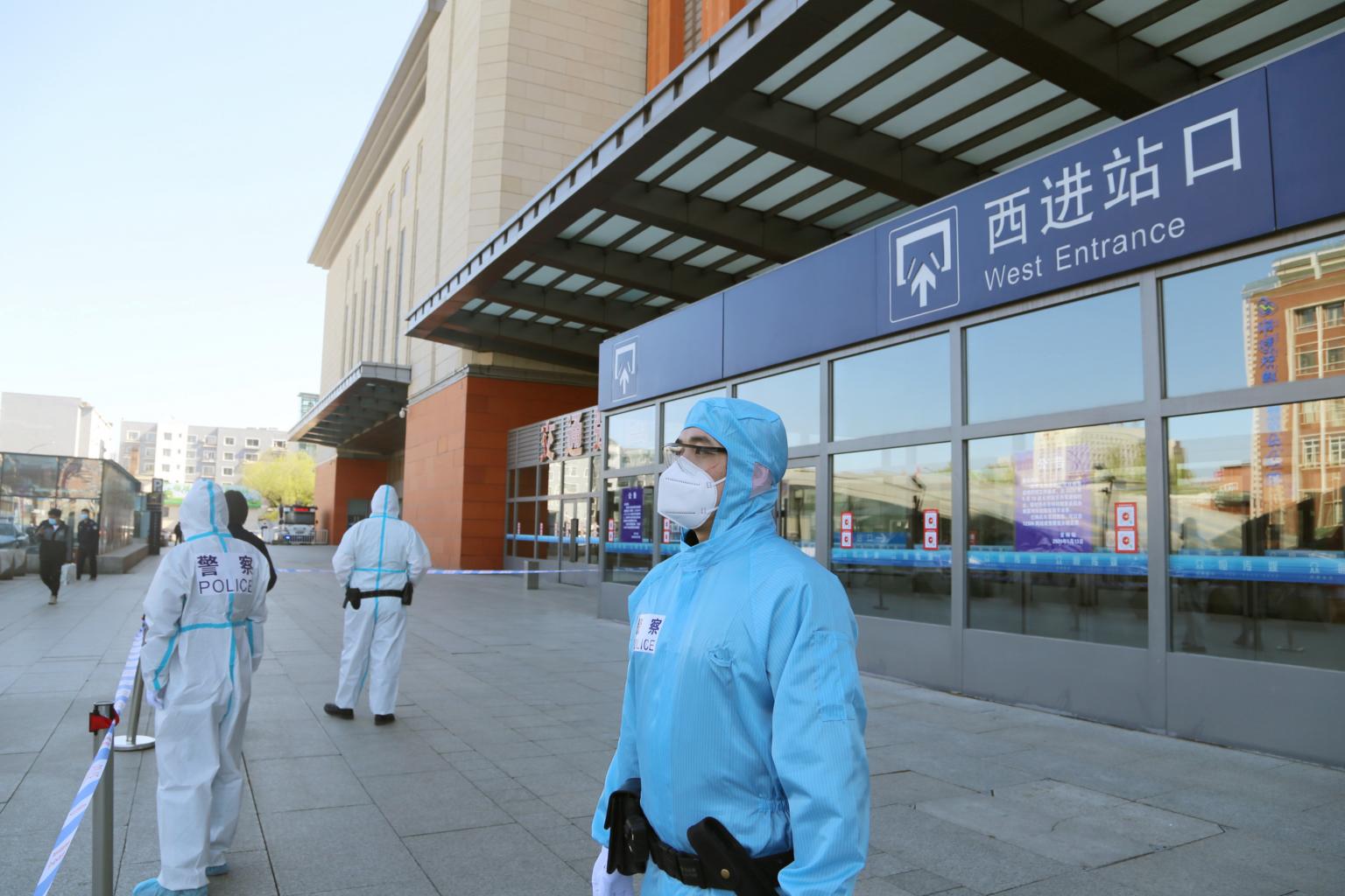 Police officers in front a closed entrance to a train station in Jilin, China, on May 13, 2020.