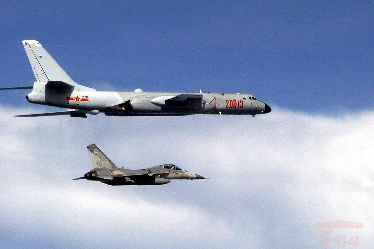 A Taiwan Air Force Indigenous Defense Fighter (IDF) jet (bottom) intercepting a Chinese H-6 bomber after it entered Taiwan's Air Defense Identificaiton Zone (ADIZ) on July 20, 2017.