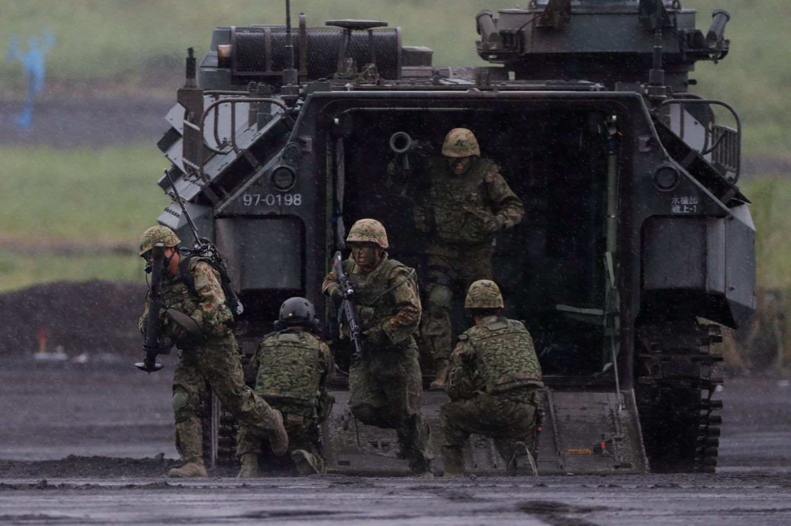 Japanese Ground Self-Defense Force members take part in an annual training session near Mount Fuji at Higashifuji training field in Gotemba, Japan, on Aug 23, 2018.