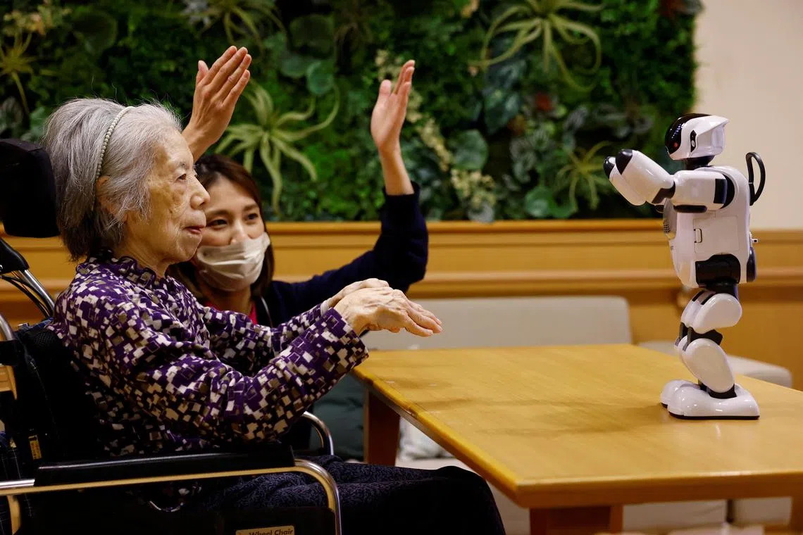 Ms Yukiko Namekata, a resident at an eldercare facility run by Zenkoukai, and her caretaker follow the movement of a miniature humanoid robot Palro at the facility in Tokyo, Japan.